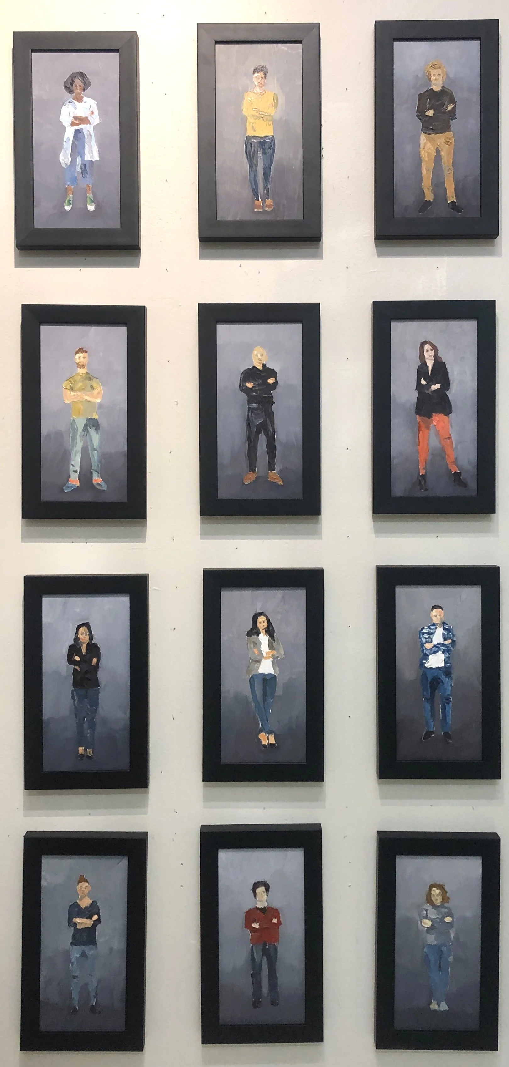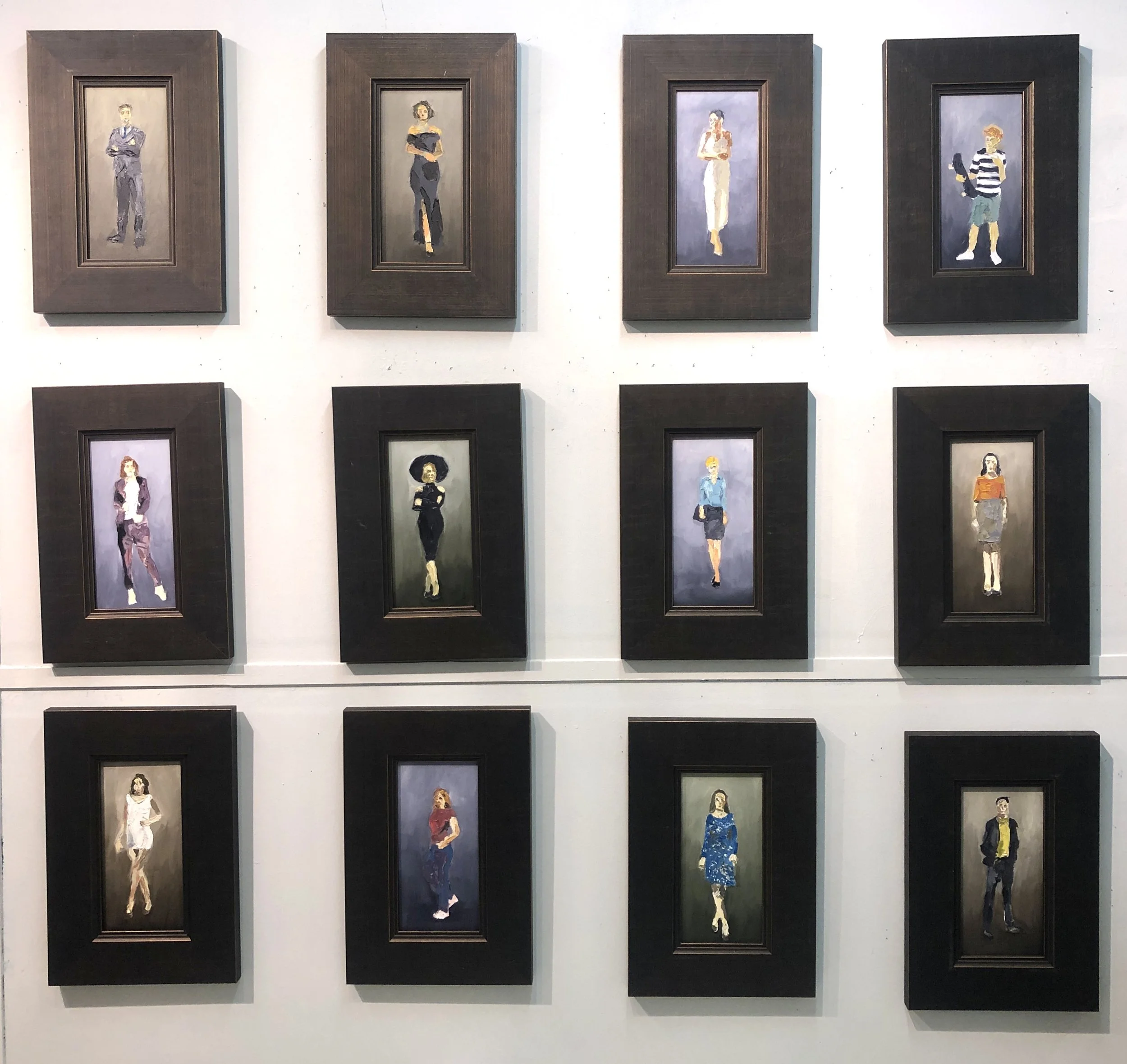 Each full figure portrait is given the same space on a 6”x12” panel and titled based upon a fictional narrative of their identity or character such as “the groom,” “the straight-A student,” “the soccer mom,” and more.