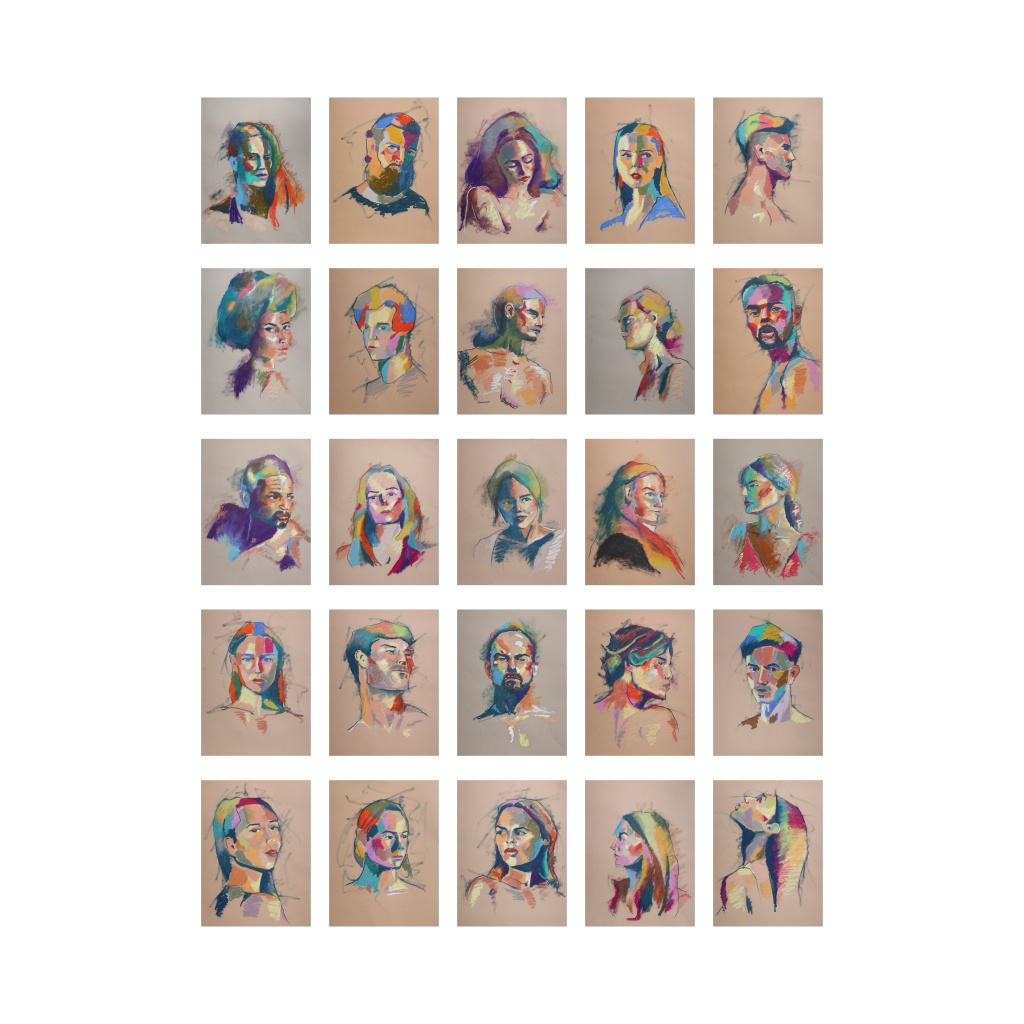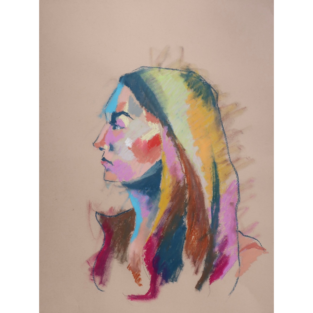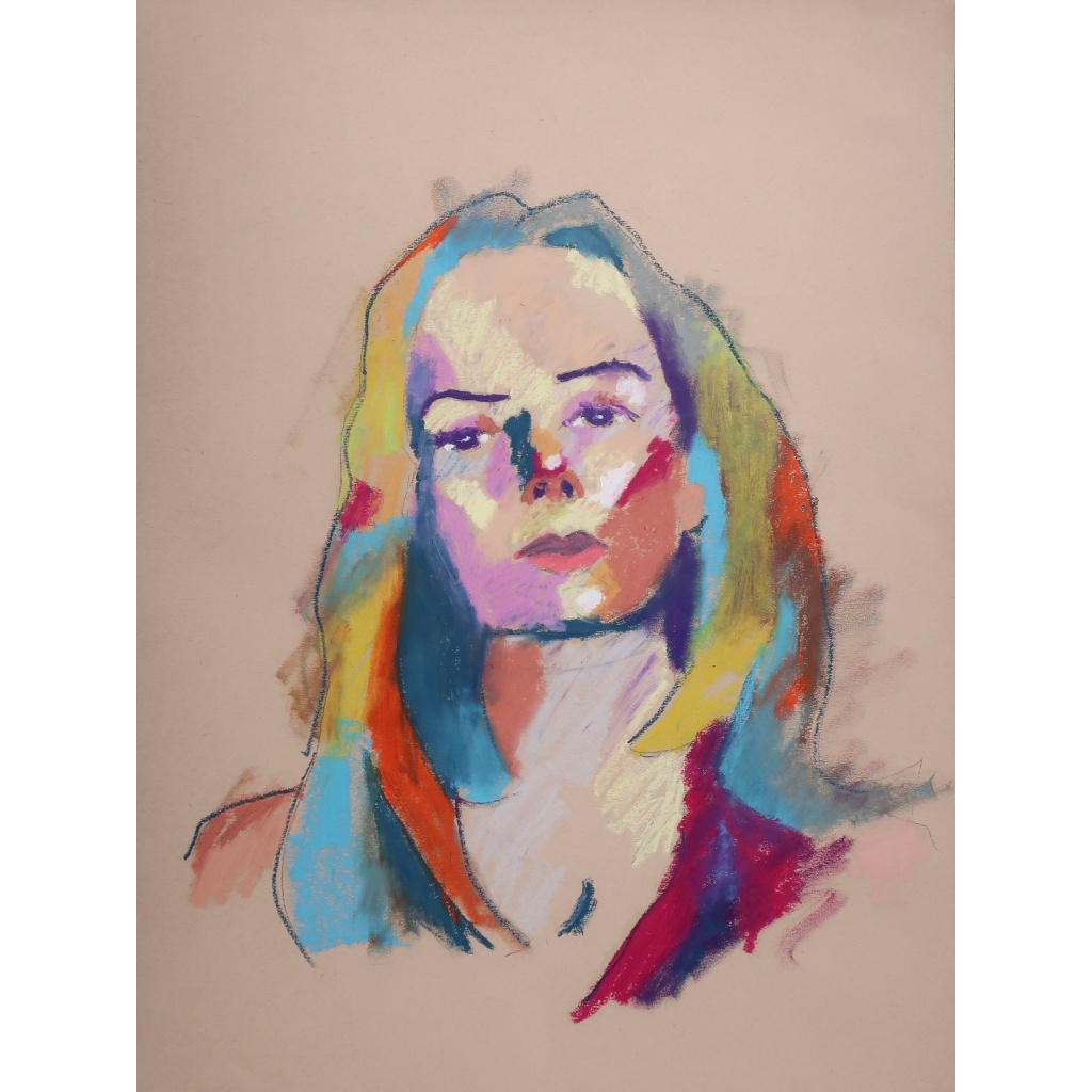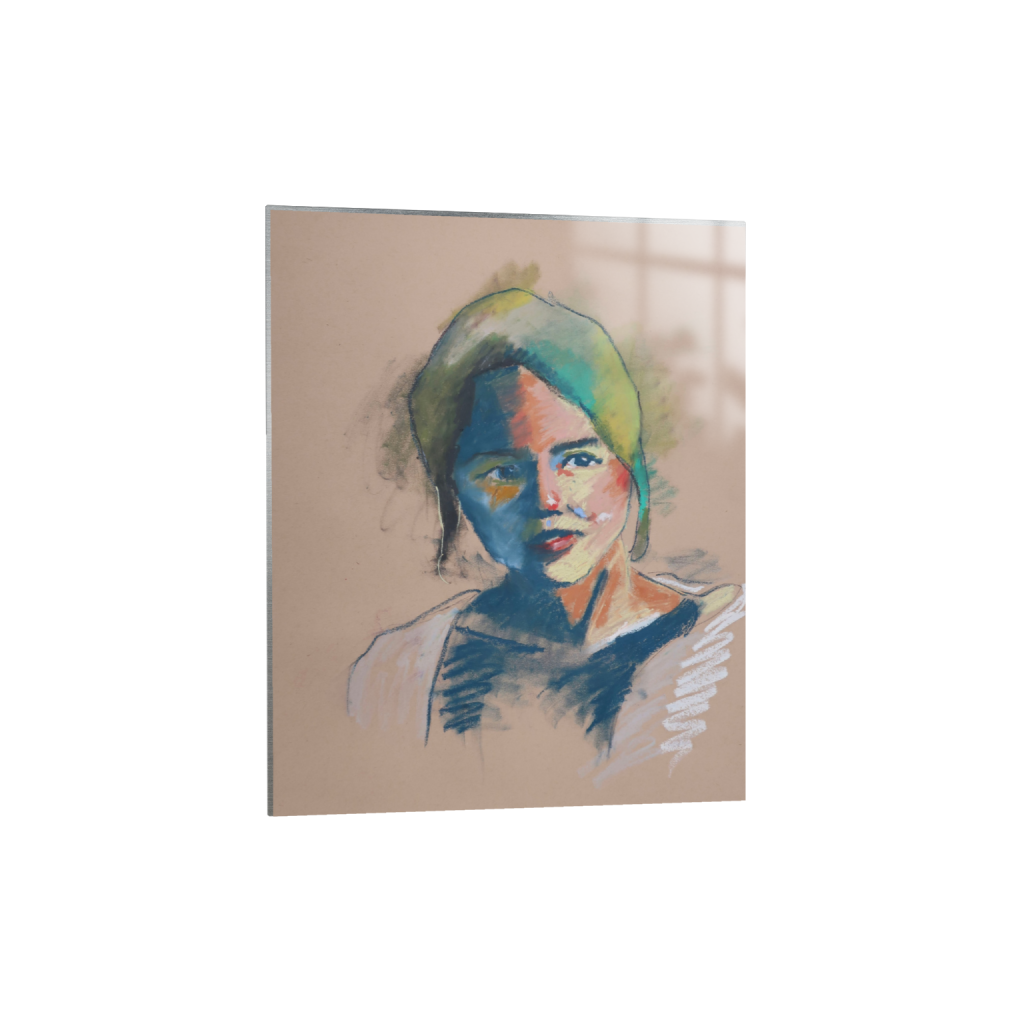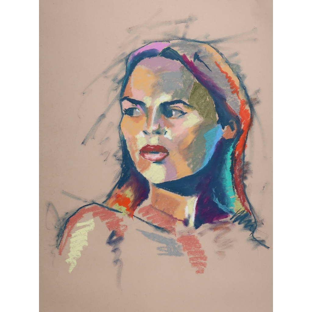 These pastel works are done by laying one color down on the paper first, then discerning a color that can compliment or juxtapose it in someway next to it while still using the model as reference. Overall it is the play of color while still holding true to the reference. They are available as prints on metal or paper.